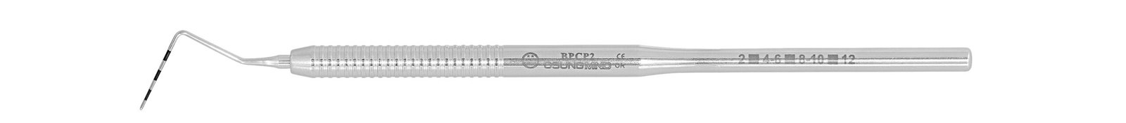 Dental Probe, PCP2. Stainless Steel Handle. The working ends are marked in millimeters (2-4-6-8-10-12) for precise measurements. The calibrated periodontal probe is an instrument of assessment. The calibrated probe is used to 1) determine the consistency of the gingival tissue 2) survey sulcus and pockets depths 3) measure clinical attachment levels 4) measure the width of attached gingival 5) verify whether bleeding and/or purulent exudate is in presence